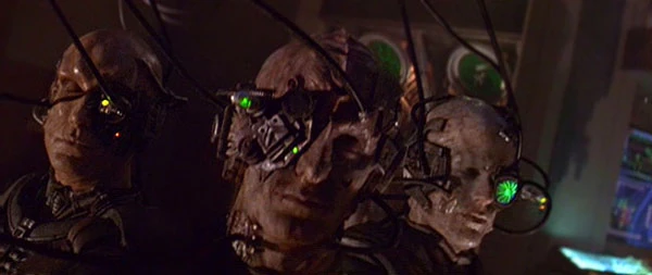 The Borg Collective was made up of at the very least trillions of humanoids referred to as drones. (VOY: "Dark Frontier") Through the use of their cybernetic implants, the Borg interacted by sharing one another's thoughts in a hive mind. Upon assimilation, these trillions of "voices" would overwhelm the drone, stifling individual thought and resistance to the Collective's will. (TNG: "Family") To some drones these voices could eventually become a source of comfort, and their absence a source of pain. (TNG: "I Borg"; VOY: "The Gift")