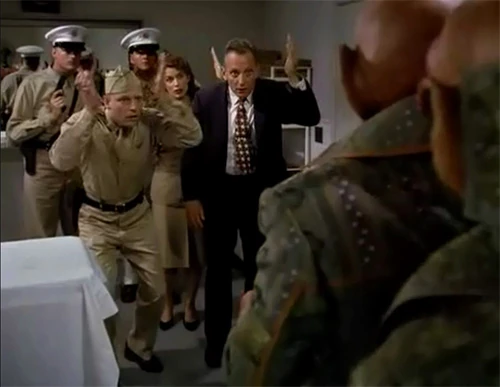 Quark introduced himself as a Ferengi, the chief financial officer of the Ferengi Alliance, and wanted to sell advanced technology to the United States in exchange for gold. He claimed the Ferengi had conducted surveillance of Earth for years and knew everything there was to know about Humans. He threatened to sell the technology to the Soviet Union if the Americans wouldn't buy it from him. Rom attempted to tell the interrogators the truth, that they were accidental time travelers from the future. Nog in turn attempted to tell the interrogators what they wanted to hear, that they were scouts of a massive alien invasion force that was orbiting the Earth and about to invade the planet.