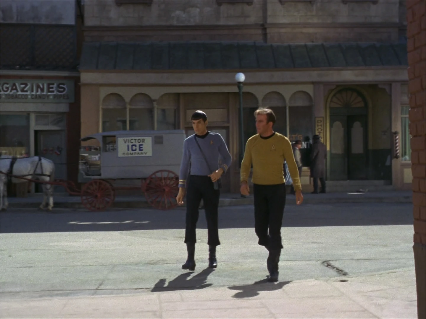 An unofficial first encounter between Humans and a Vulcan occurred during the Depression era in New York City. In 1930, Kirk and Spock, a Vulcan from the 23rd century, traveled through time and walked on the streets of New York being witnessed by many. When the two were caught stealing clothes by the police, Kirk attempted to explain to the officer that Spock was Chinese and his ears the result of a childhood accident. After they escaped from being taken into custody, Spock disguised his Vulcan appearance. (TOS: "The City on the Edge of Forever")