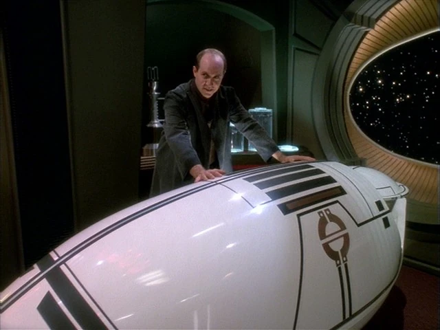 Weyoun turns to Giger and asks for an explanation of his machinery. Jake says Giger is harmless, he's just crazy. Nog agrees, saying Giger was trying to become immortal. Weyoun suddenly gets very excited. "Really?" He says to Giger. "I have a background in 'creative genetics,' perhaps I could be of help." Giger says it will take some time to explain his theories. As Giger starts to explain the chamber, Weyoun allows Jake and Nog to leave... with the baseball card.