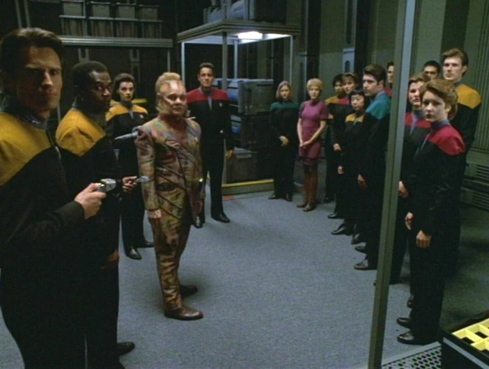 In "Caretaker", the Maquis aboard the USS Voyager donned Starfleet uniforms, due to Michael Piller having lost the debate over whether they should do so. "Depending on your point of view," Ronald D. Moore pointed out, "[that] was or wasn't a huge mistake." (Star Trek: The Next Generation 365, p. 352) It was clear that, in Moore's opinion, the rapid assimilation of the Maquis into the USS Voyager's crew started the vessel seeming to become essentially identical to any other ship in Starfleet. "By the end of the pilot, you have the Maquis in those Starfleet uniforms, and – boom – we've begun the grand homogenization," he critiqued. [1]