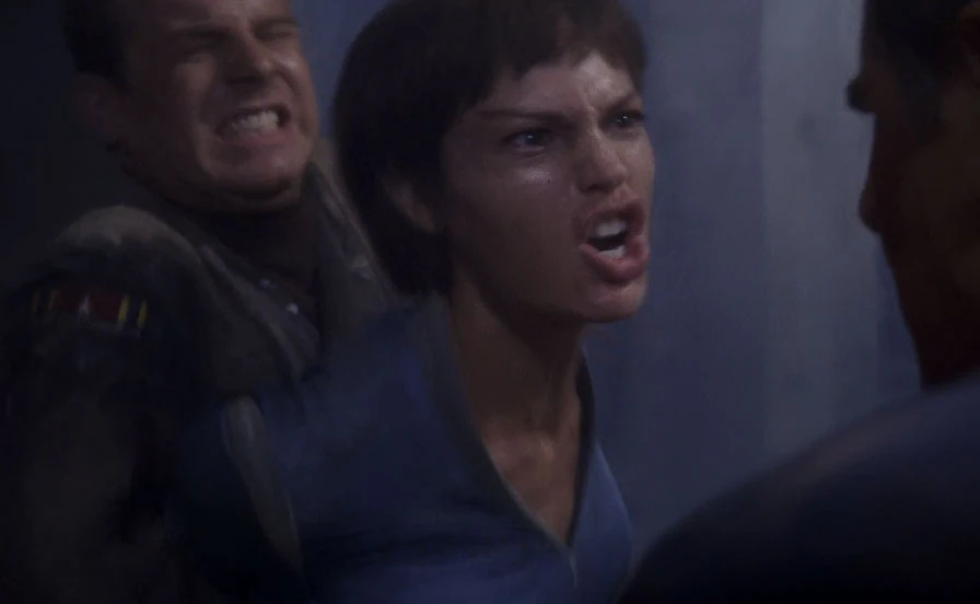 Not long after their arrival in the Expanse, the crew of Enterprise located T'Pol's former ship, the Seleya, which was caught in a trellium-D asteroid field. She, Archer and Reed took a shuttlepod to rendezvous with the Seleya, where they found the ship's surviving crew suffering from severe dementia and homicidal rage. Discovering Commander Solin among the survivors, T'Pol was unable to reason with her former shipmates and simultaneously found herself succumbing to feelings of paranoia and anger. She started to lead Archer and Reed through the damaged Vulcan vessel to find an escape route, but began to suspect that Archer meant to murder the ship's Vulcan survivors and refused to cooperate. As the group neared escape, T'Pol became violent and was stunned by Archer until she could receive treatment aboard Enterprise. (ENT: "Impulse")