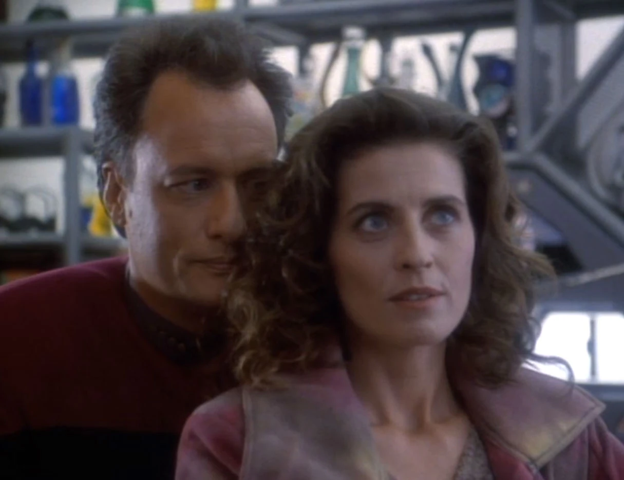 Vash's presence on Deep Space 9 did not go unnoticed by Dr. Bashir who made advances towards her; nor by her former partner. Q attempted to lure her back to him by enticing her with the possibility of more adventures to exotic locales such as the Teleris Cluster, the Lantar Nebula, and Vadris III. She turned down Q's repeated entreaties, much to his disappointment; though she did seem to retain some level of partiality to the entity. Vash briefly considered becoming a lecturer at the Daystrom Institute, which was interested in her because of her time spent in the largely still unexplored Gamma Quadrant. However she was convinced by Quark to continue her journeys, with him as a backer and business partner. Quark kissed her affectionately on the hand as they walked away discussing their plans. (DS9: "Q-Less")