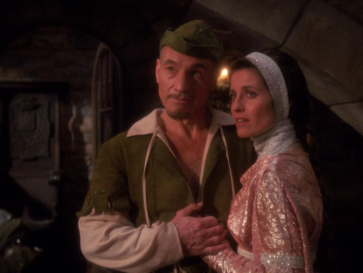 Q staged a Robin Hood fantasy in which Picard was forced to choose between rescuing Vash, herself forced to play the part of Maid Marian, or letting her die at the hands of Sir Guy of Gisbourne. Picard was ultimately successful in his rescue, and the fleeting bitterness of their earlier reunion faded as the two rekindled their affection for each other. (TNG: "Qpid")